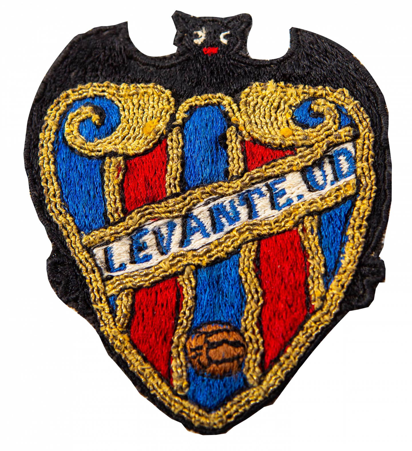 Escudo del Levante U.D. perteneciente a Alberto Pascual Escriche. El gandiense defendió durante numerosas temporadas los arcos de la porteria de la entidad granota. Dicho emblema quedaba sujeto a su jersey de portero, conteniendo la particularidad visible de mostrar los ojos y la boca del murciélago que coge y protege el escudo de la entidad levantinista. Esta singularidad fue usual durante las décadas de los años 40 y 50 del siglo, tratando de dotar de una caracterización más viva a la ilustre y simbólica criatura.