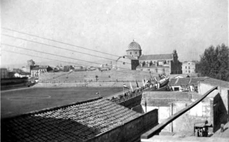 Vallejo incrustado en el barrio, rodeado de casas, con la Estación de Ferrocarriles y las Torres de Serranos despuntando.