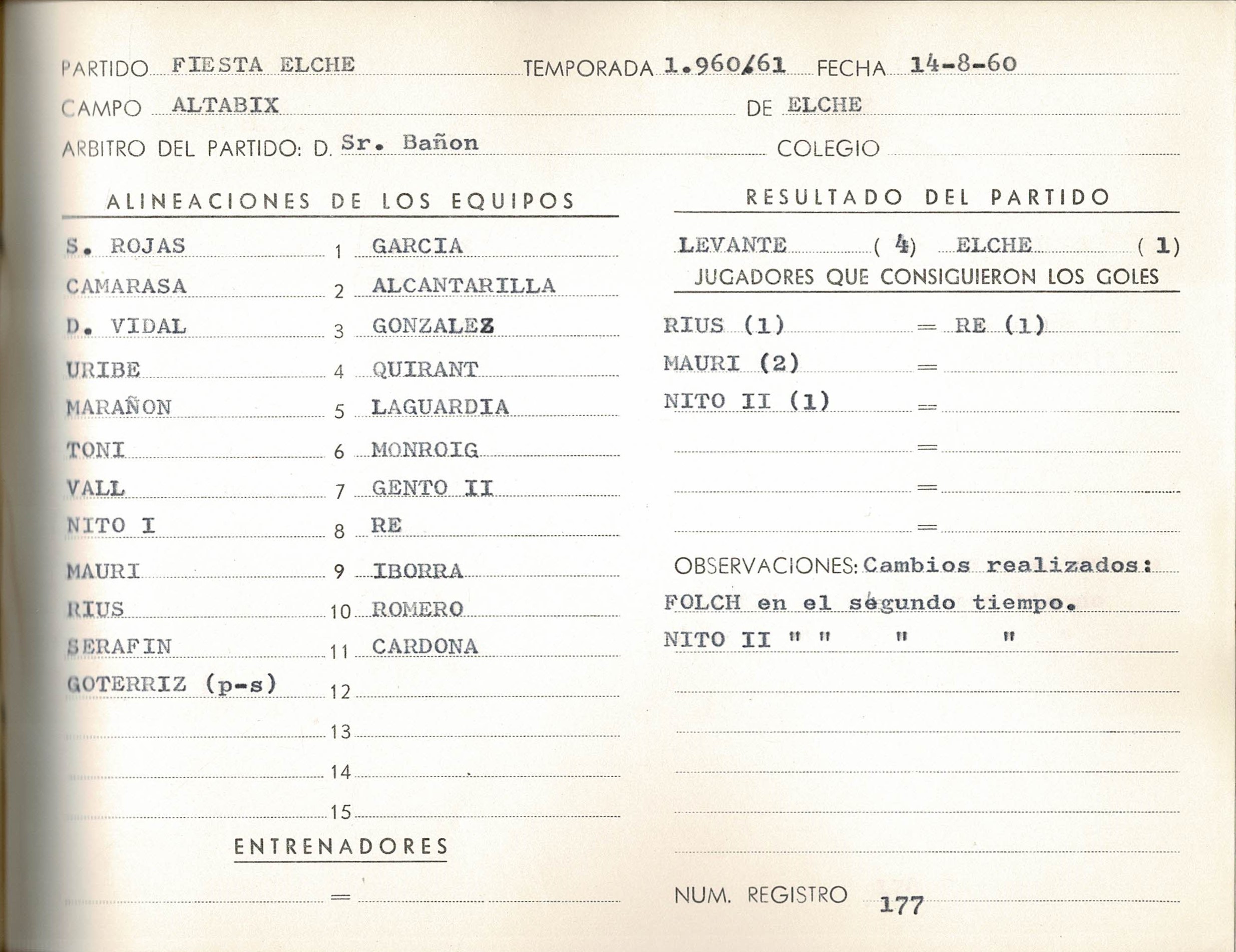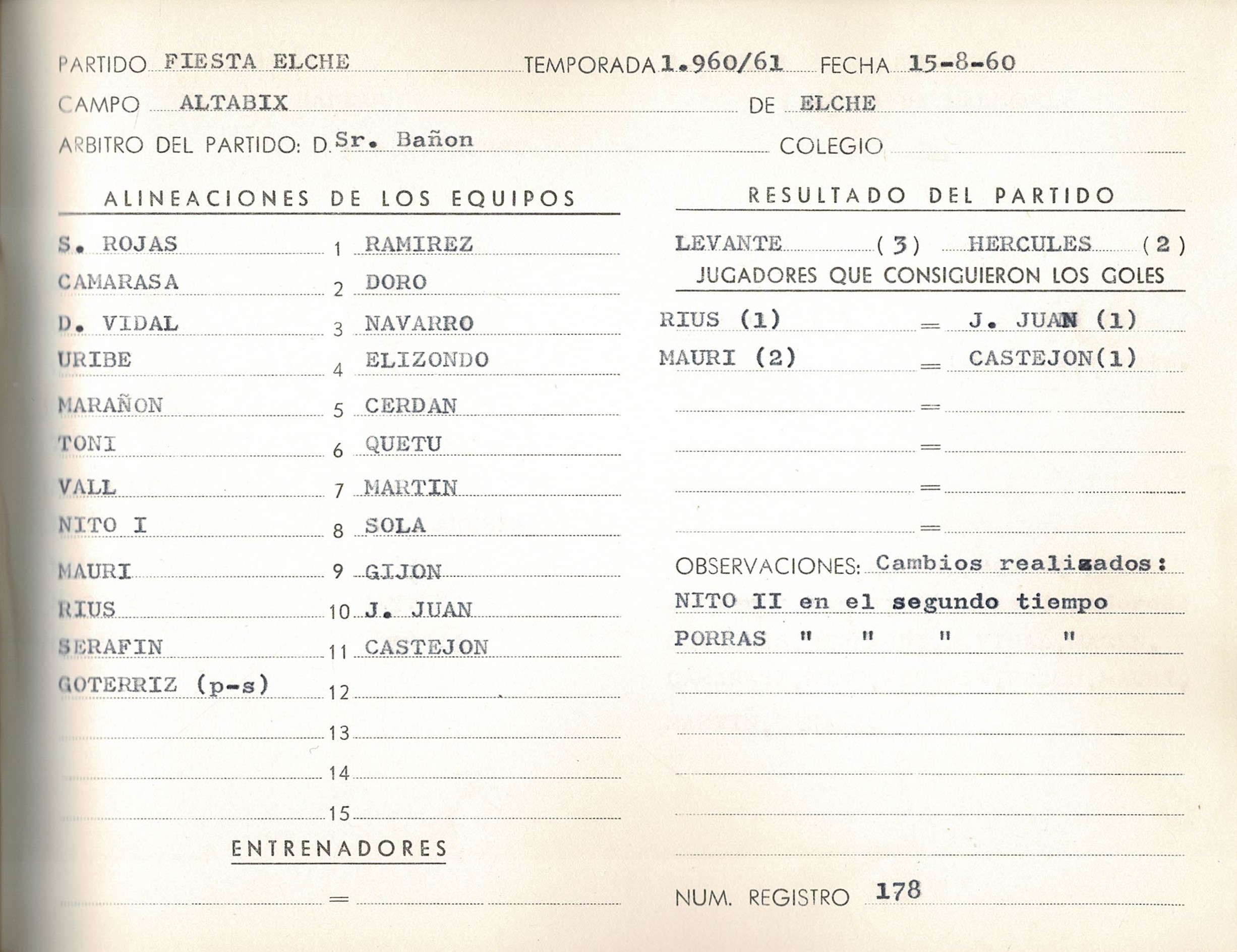 El encuentro terminó con victoria granota por 1-4. Para la historia un hito fundamental: Antonio Rius anotó el primer gol de la historia del torneo. Como consecuencia Rius, una de las novedades para el curso 60-61, inauguraba el registro goleador de la naciente competición. No obstante, el paso de las décadas, consolidaría el Festa d’Elx como uno de los torneos más reconocidas del verano futbolístico español.